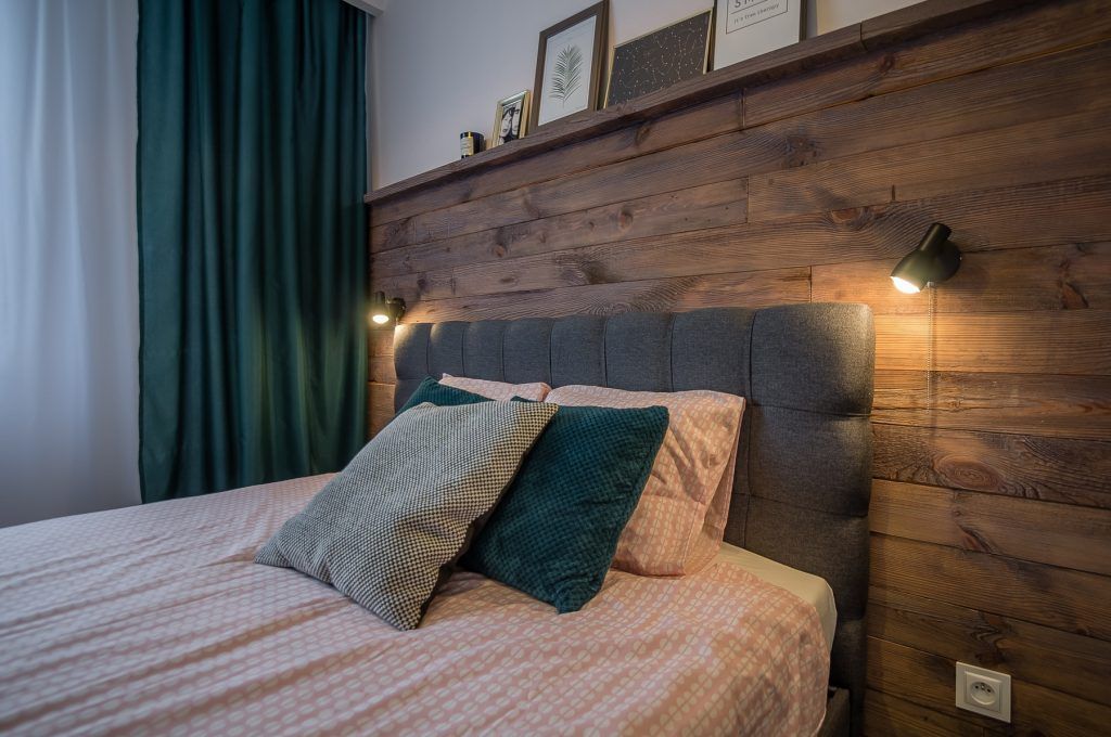 In dormitor, linia designului urmarit merge pe aceeasi idee a unui stil actual, modern, confortabil. Placarea partiala a peretelui cu patul aduce un plus de textura amenajarii, iar tablia tapitata asigura un plus de confort. Nu a fost omis un detaliu important: depozitarea. Vom gasi dulapuri pentru haine si lucruri variate atat in spatiul dormitorului, cat si in hol.