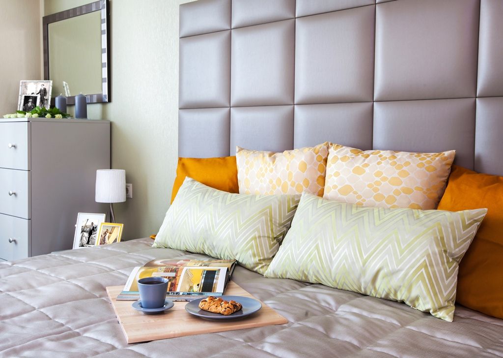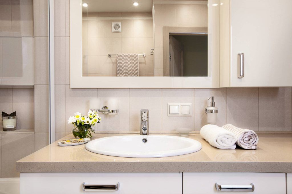 Pentru dormitor a fost conturata o amenajare calda, placuta si odihnitoare. Peretele-accent din dreptul patului a fost conturat cu un verde pastel, iar restul spatiului ramane neutru cu griuri colorate, crem, alb si nuante de lemn. Tablia tapitata cu care este completat cadrul patului ofera un plus de confort atunci cand iti doresti sa citesti sau doar sa te sprijini. Dimensiunile dormitorului au permis si integrarea unui dressinggeneros dar si a unei comode. Si in baie, amenajarea urmeaza latura functionala, cu crem si bej ca elemente cromatice predominante alaturi de alb. Spatiile de depozitare sunt integrate in zona de sub lavoar, dar le regasim si la nivelul celor doua nise create in dreptul cazii.