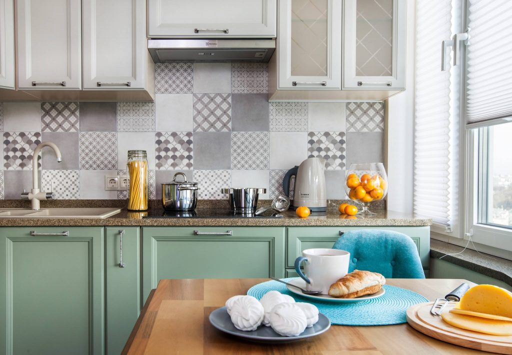 In bucatarie, amenajarea este gandita cat mai functional posibil. Mobilierul este dispus pe ambele laturi ale incaperii optimizand spatiile de depozitare. In acelasi scop, dulapurile sunt inalte, mergand pana in tavan. Pentru frontul corpurilor principale a fost ales un verde-menta, iar pentru cele suspendate un alb murdar pentru a pastra luminozitatea camerei. Combinatia de culori este placuta si potrivita pentru o bucatarie, la fel si alegerea placilor decorative pentru braul dintre piesele de mobilier. Electrocasnicele sunt incorporate pentru a pastra caracterul unitar al amenajarii si pentru a mai castiga spatiu. Locul destinat meselor preia turcoazul din living, iar masa este extensibila pentru momentele cand sunt musafiri.