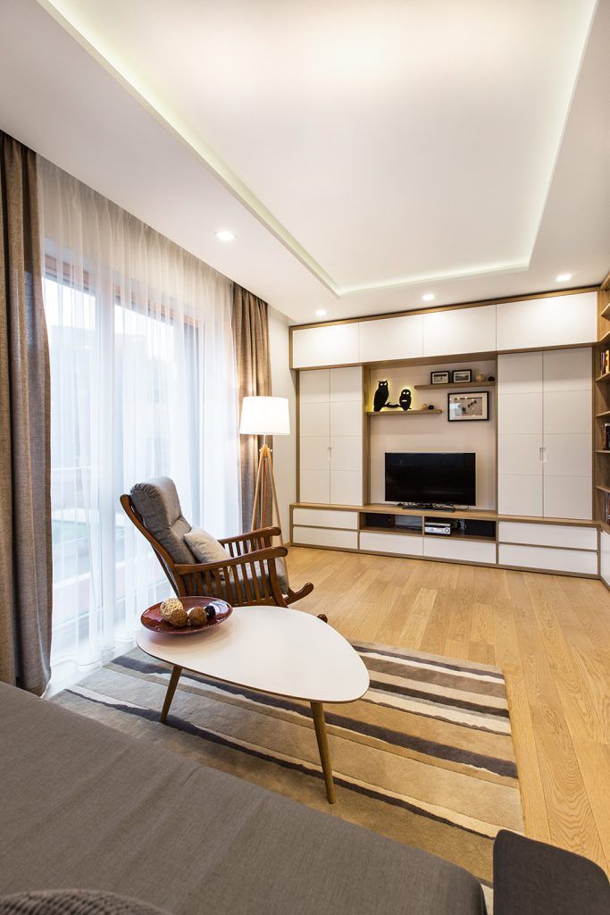 Albul este predominant, iar insertiile de lemn pe care le regasim din belsug in decor fac trimitere la cadrul natural din apropiere. Designul ne aminteste de interioarele scandinave, cu multa lumina si mobilier optimizat pentru nevoile beneficiarilor. Zona de conversatii este reunita in perimetrul descris de covor, fiecare functiune fiind astfel bine evidentiata in cadrul amenajarii.