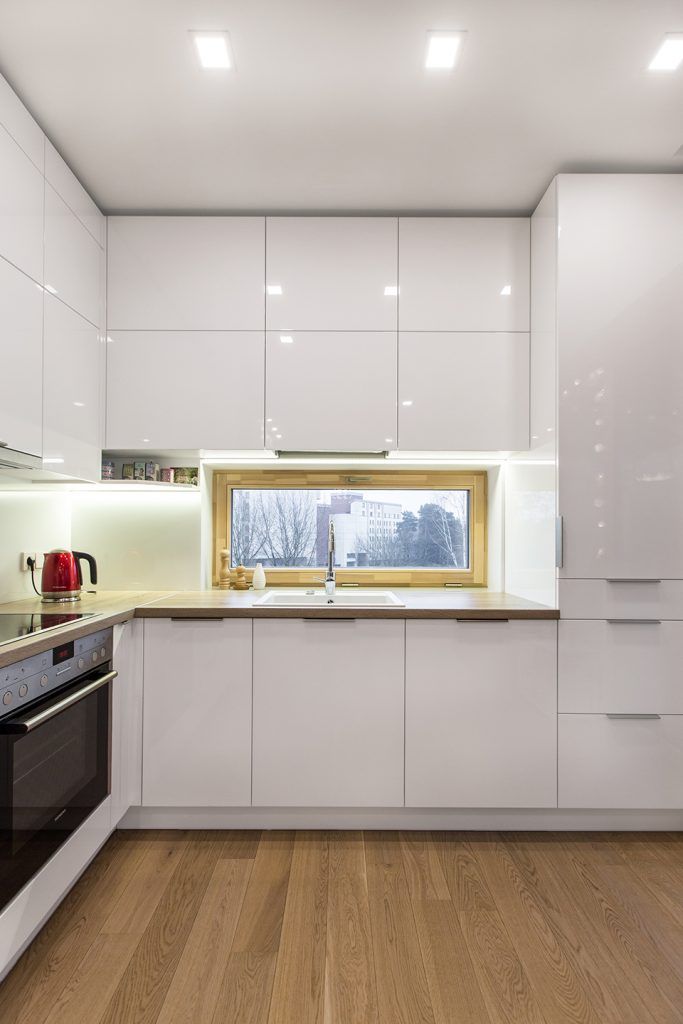 Bucatariaeste dispusa sub forma literei L, cu mobilier minimalist si finisaj din M DF alb lucios. Electrocasnicele sunt incorporate in mobilier creand un aspect unitar al decorului, necesar mai ales in spatiile deschise. Interesant este geamul inserat intre corpurile de mobilier ce asigura un plus de lumina naturala zonei de gatit si implicit celei de spalat.