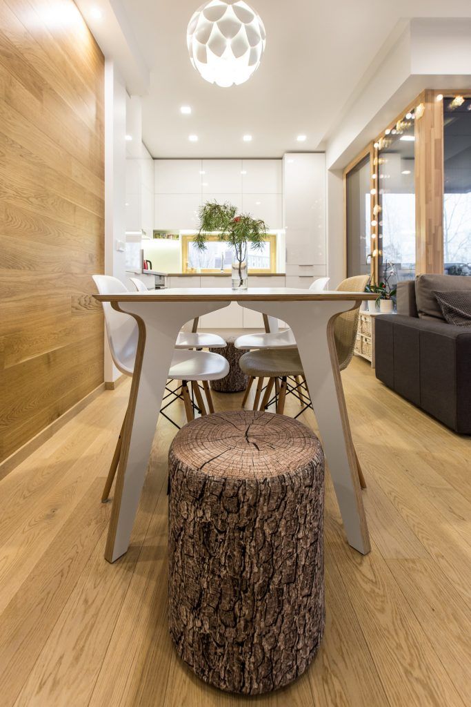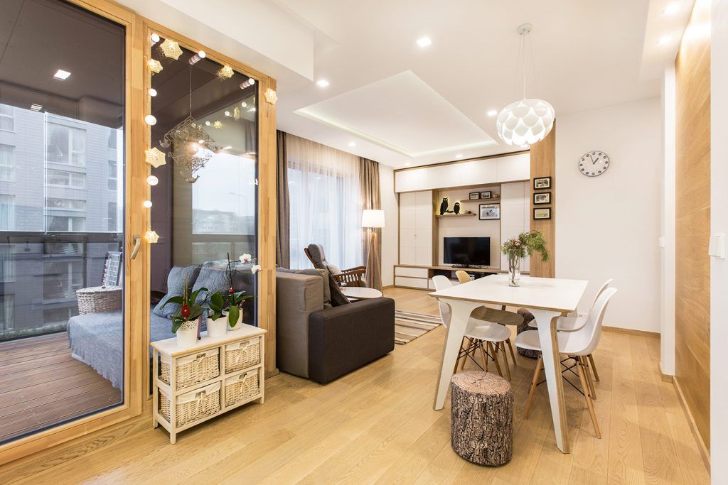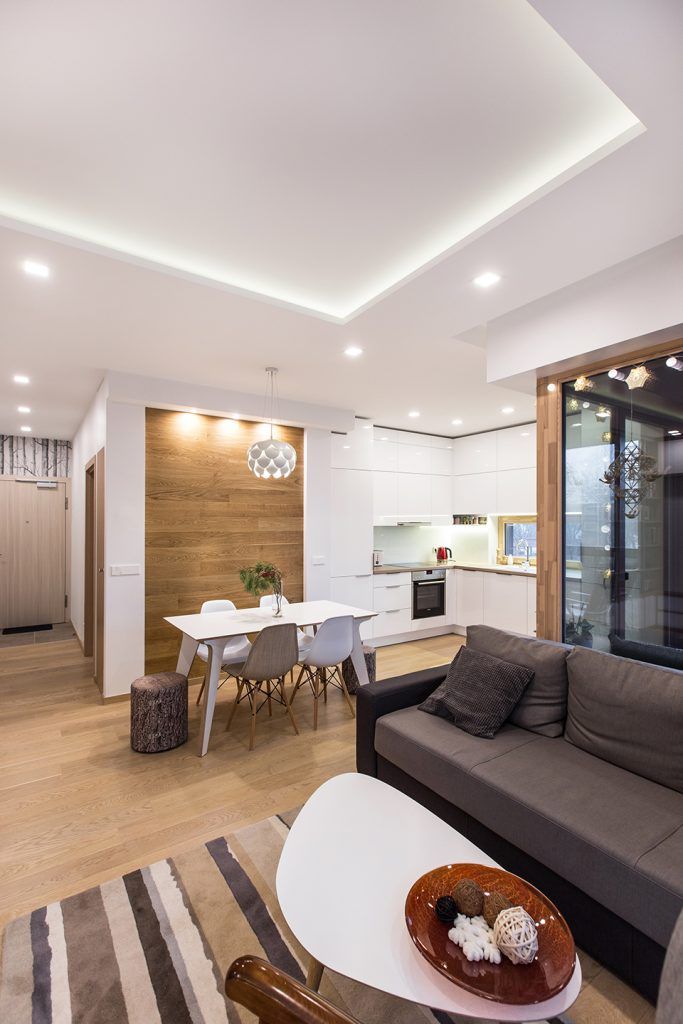 Zona de zi este un spatiu privilegiat in acest apartament. Functiunile se inlantuiesc armonios si permit circulatii firesti in interiorul camerei. Fotoliul-balansoar alaturi de lampadar compun un minunat loc de lectura, iar diningul face o trecere discreta spre zona bucatariei; pentru a scoate in evidenta acest spatiu, peretele din dreptul mesei este placat cu lemn.