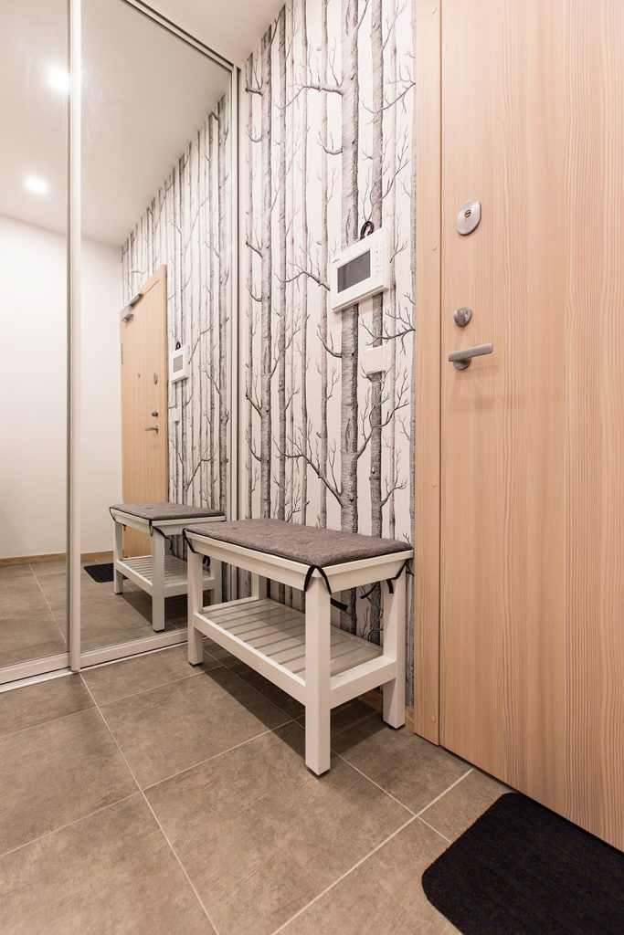 Dressingul cu usi acoperite cu oglinzi lasa impresia ca spatiul pare mai mare, un truc excelent integrat in acest spatiu restrans al holului.