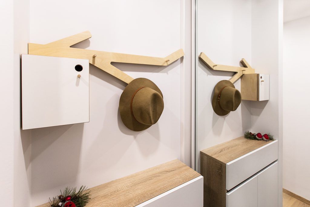 Balconul a fost gandit ca un fel de prelungire a livingului in exterior, unde poti petrece timp in zilele sau serile calduroase si nu numai. Tematica naturii o regasim si in hol prin tapetul cu mesteceni amenajat pe peretele cu usa de la intrare sau prin cuierul traforat in forma de creanga.