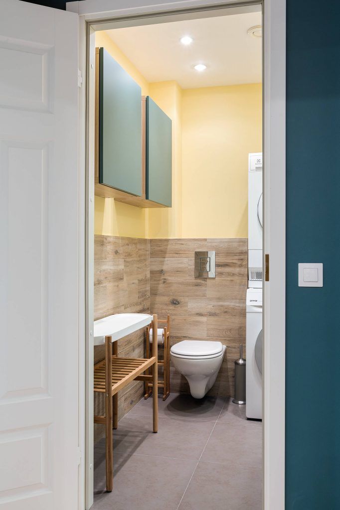Zona holului de trecere este evidentiata prin zugravirea peretilor intr-un albastru-turcoaz intens, iar cea de la intrare marcata printr-un tapet cu un imprimeu discret. Pentru a crea un contrast, s-au integrat piese de mobilier alb, inclusiv usi albe. Pentru ca si spatiul holului de la intrare sa primeasca lumina naturala, a fost integrata o partitie tip fereastra – ingenioasa idee!