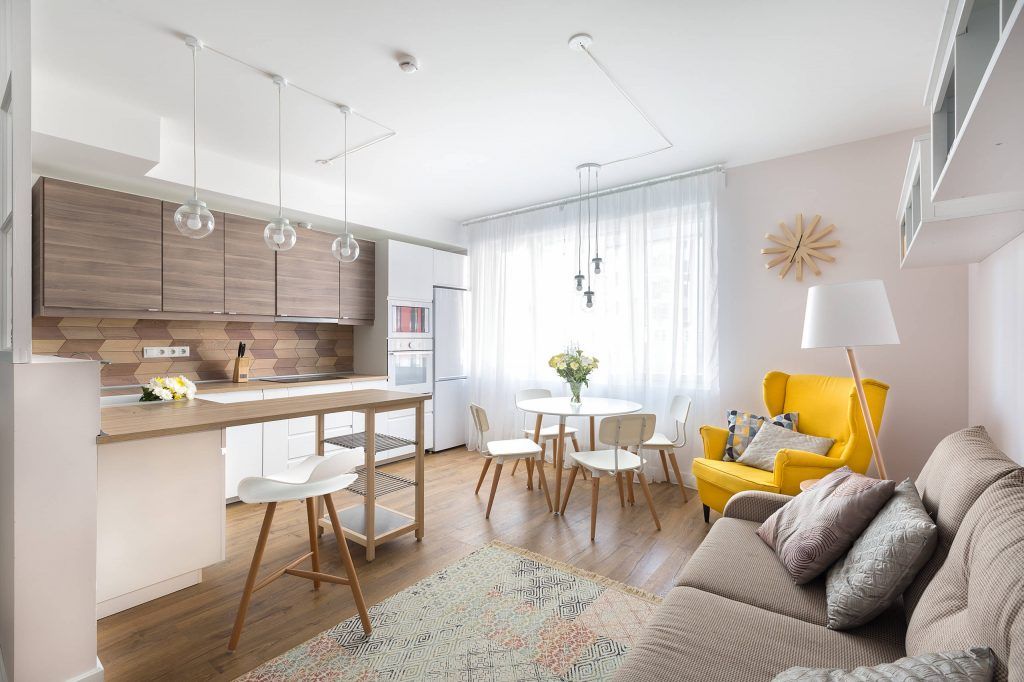Desi exista doua functiuni principale, pe langa ele vom gasi si un loc pentru luat masa amenajat chiar la fereastra, dar si un spatiu mic creat pentru lectura (vezi fotoliul si lampadarul).
