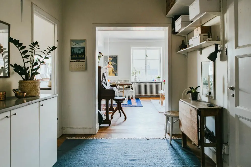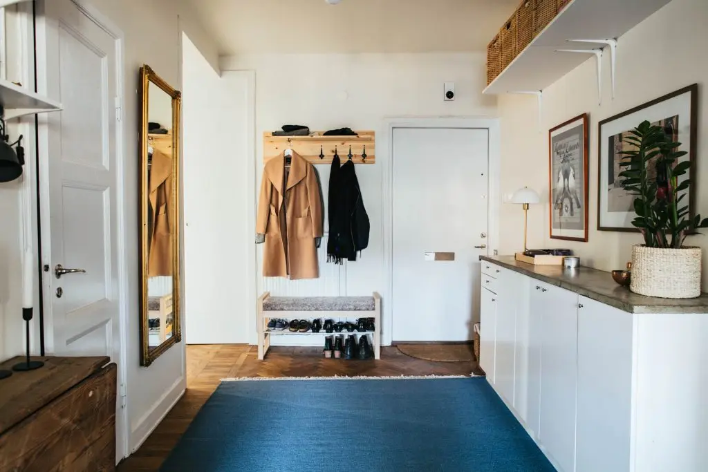 Ajungem si in hol. Aici, spatiul usor intunecat este compensat prin albul peretilor si al mobilierului. Dulapurile sunt de inaltime medie pentru a nu lasa impresia de sufocare. Accesoriile, plantele, decoratiunile discrete ofera personalitate unui spatiu deseori ignorat.