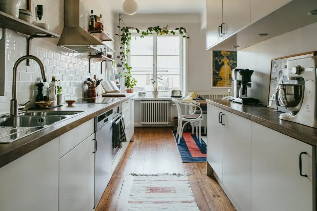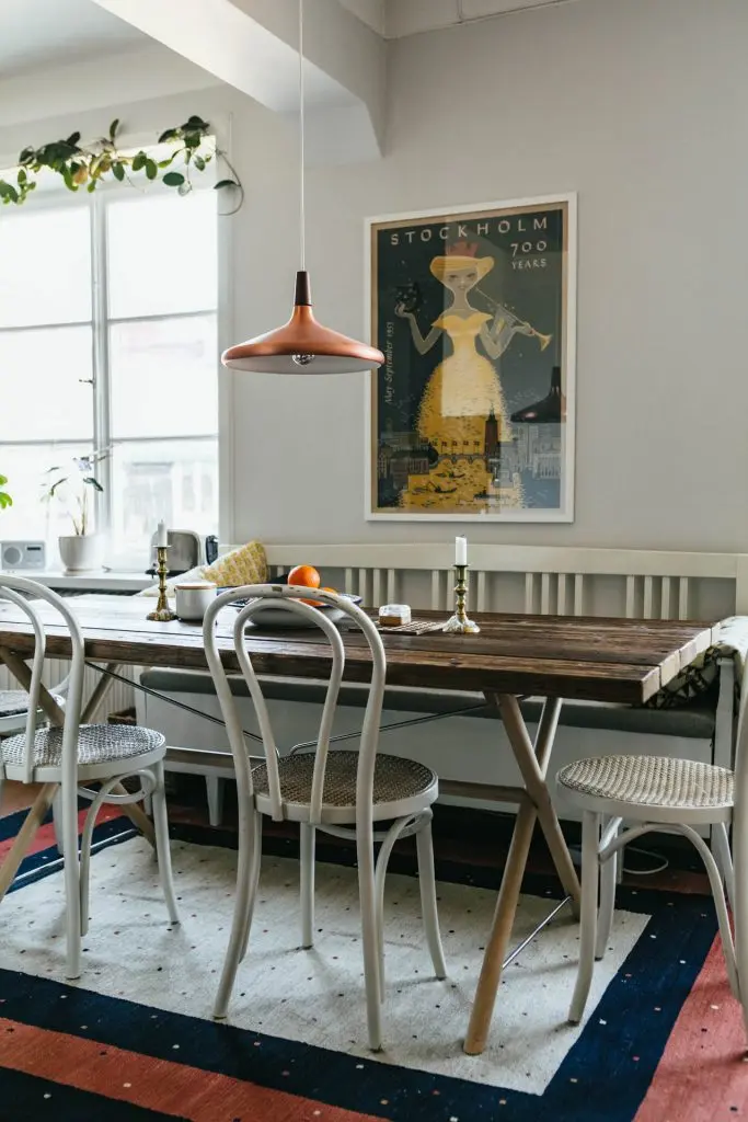 Bucataria a fost amenajata sub forma unei dispuneri paralele a mobilierului, oferind astfel suficient spatiu pentru depozitare si loc pentru gatit. Electrocasnicele mari sunt incorporate pentru unitatea vizuala a amenajarii. Ne plac etajerele pe care sunt expuse diferite obiecte specifice bucatariei si nu numai. De aici, pornim firesc spre locul unde este amenajat un dining. Lemnul brut al blatului mesei sau scaunele vintage, precum si bancheta descriu tonul unui decor pe care il vom regasi de-a lungul intregii amenajari.