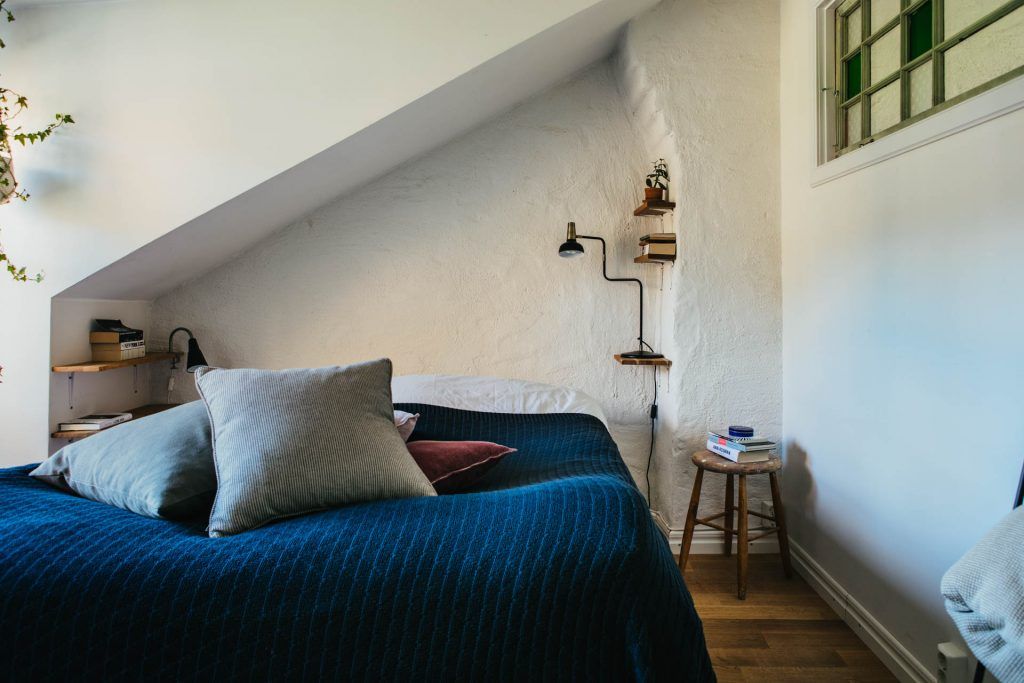 Una din camerele preferate este unul din cele 2 dormitoare cu o deschidere minunata spre terasa si implicit priveliste panoramica de admirat. De fapt, aceasta incapere este dedicata unei zone de socializare, incluzand si un televizor precum si 2 locuri de sezut generoase cu perne decorative si saltele suplimentare. Am putea-o usor numi o camera pentru prieteni de petrecut timp cu ei sau gazduit peste noapte. Ambele camere sufera la capitolul spatiu din cauza inclinarii tavanului, dar compenseaza prin confort si stare de relaxare la care te imbie doar dintr-o simpla privire a imaginilor.