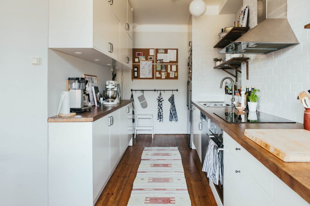 Bucataria a fost amenajata sub forma unei dispuneri paralele a mobilierului, oferind astfel suficient spatiu pentru depozitare si loc pentru gatit. Electrocasnicele mari sunt incorporate pentru unitatea vizuala a amenajarii. Ne plac etajerele pe care sunt expuse diferite obiecte specifice bucatariei si nu numai. De aici, pornim firesc spre locul unde este amenajat un dining. Lemnul brut al blatului mesei sau scaunele vintage, precum si bancheta descriu tonul unui decor pe care il vom regasi de-a lungul intregii amenajari.
