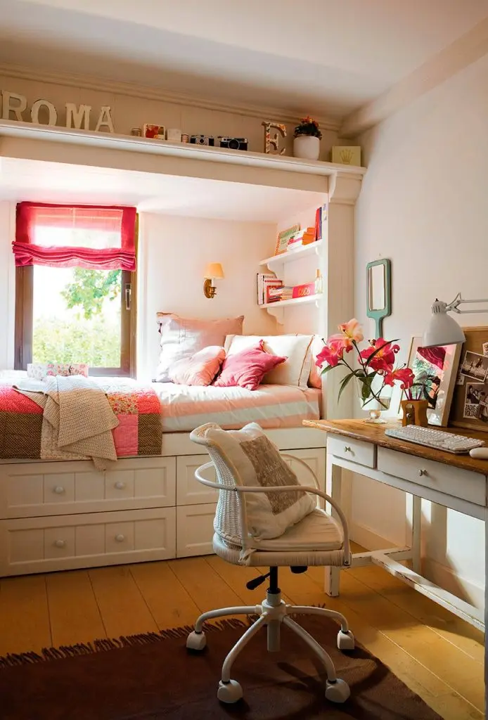 Pentru camera copilului, vom gasi o amenajare foarte placuta, ca un cuib conturat tot in jurul ferestrei. Sertarele de sub pat si politele asigura spatii pentru o depozitare variata.