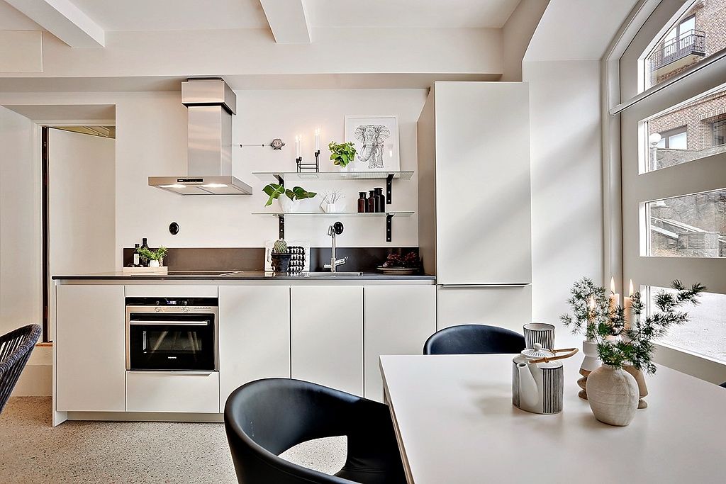 Spatiul destinat gatitului este compact, cu o dispunere liniara, unitara. Designul simplu, cu fronturi albe si electrocasnice incorporate in mobilier aminteste de prototipul bucatariilor scandinave centrate pe eficienta si functionalitate.