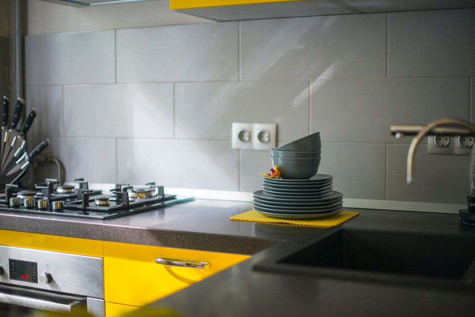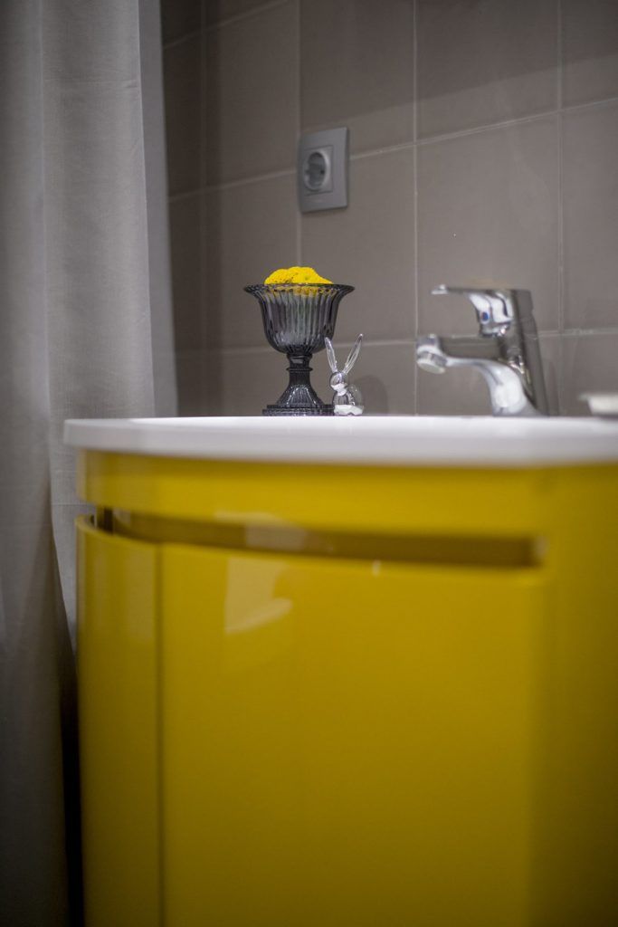 Trecerea spre bucatarie se face direct, locul de luat masa fiind amenajat la fereastra ca o zona de bar. Cele doua scaune galbene tip Eames reusesc sa atraga privirea, fiind un soi de piese-accent care sa puna in valoare aceasta mica functiune. In spatiul dintre cele doua ferestre, a fost asezat frigiderul. Configuratia in forma de L a bucatariei permite o utilizare optima, iar corpurile de mobilier asigura spatiile de depozitare necesare. Plita si cuptorul sunt incastrate in mobilier, iar hota este de sine statatoare. Frontul dulapurilor este galben, iar blatul si placile ceramice dintre dulapuri vin in doua nuante de gri, mai inchisa pentru blat si foarte deschisa pentru faianta. Tot in bucatarie a fost amplasata si masina de spalat rufe.