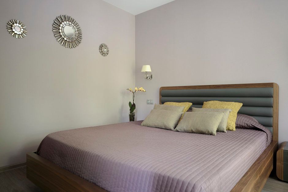 Pentru dormitor, s-a mizat pe o ambientare simpla, cat mai sumara. Patul este piesa principala, cu doua noptiere joase. Cadrul patului este prevazut cu o tablie tapitata pentru a spori confortul, iar peretele-accent vine intr-o nuanta de violet discreta, deschisa amintind de tematica utilizata.