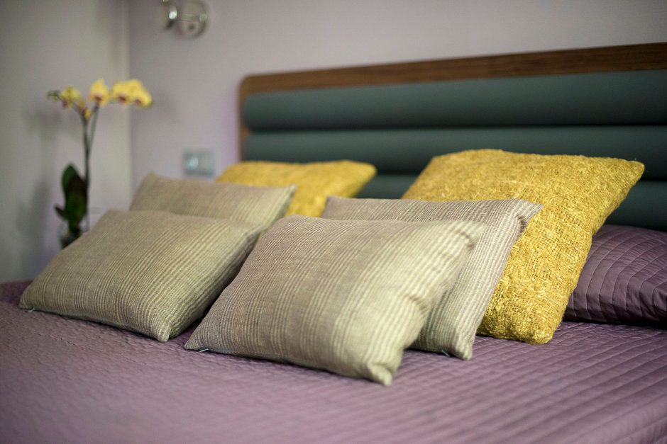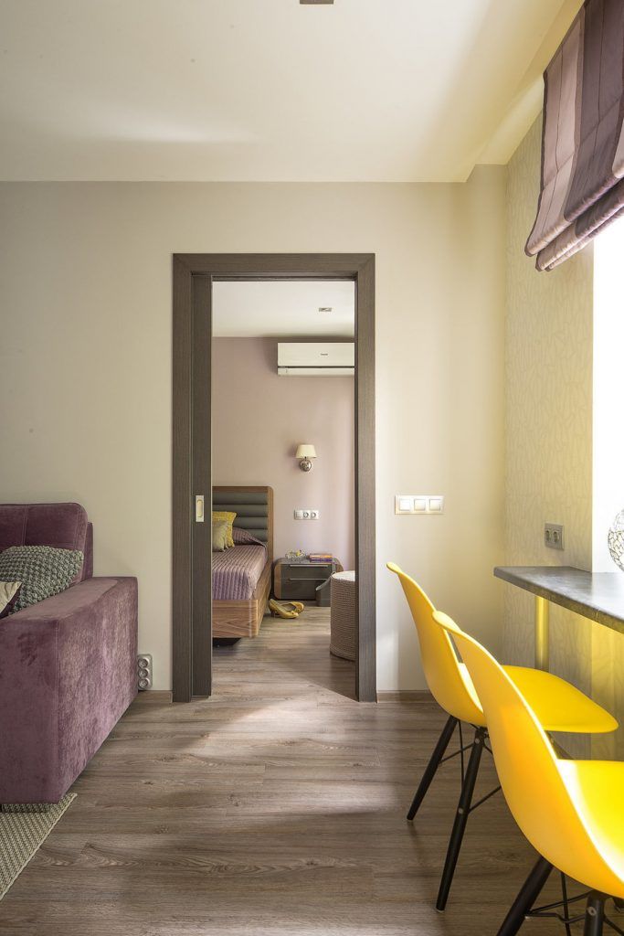 Accentele cromatice de galben si violet dinamizeaza decorul si ii confera un aer tineresc, modern. Culorile comunica coerent la nivelul amenajarii, violetul fiind prezent in diferite forme: materialul canapelei, draperiile romane, cuverturile sau dulapul din baie; in aceeasi masura galbenul echilibreaza tonurile reci si imprima caldura amenajarii.