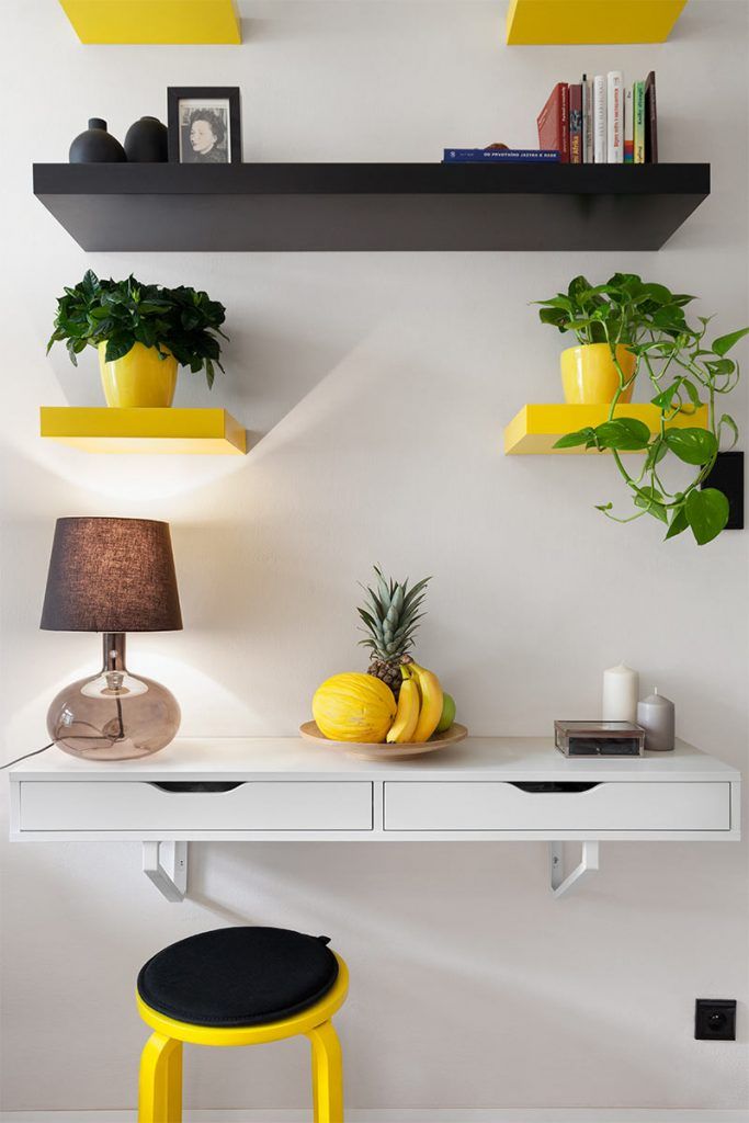 Ai putea fi tentat sa crezi ca sunt prea multe culori pentru unapartament mic. Dar sunt atat de bine echilibrate si in proportii potrivite astfel incat sa nu oboseasca privirea. Intensitatea galbenului e potolita de griuri, dar pusa in valoarea de albul mobilierului sau peretilor.