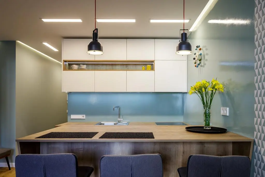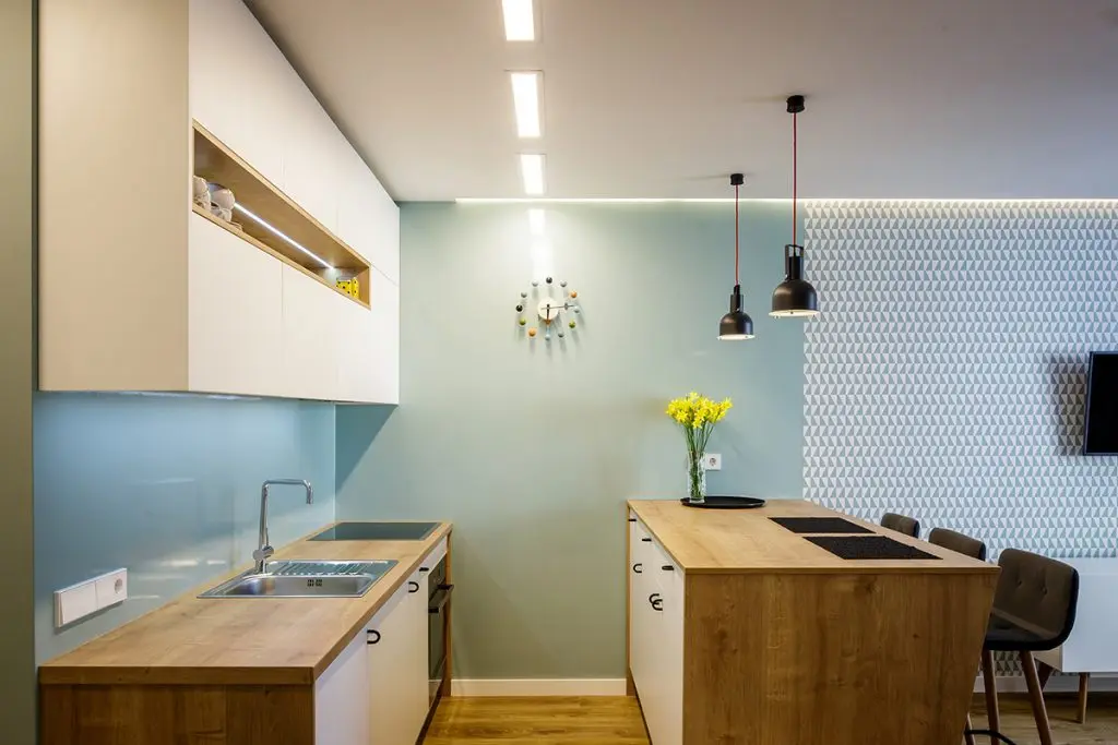 Tot in aceasta incapere, vom gasi si bucataria. Fiind destinat inchirierii, s-a mizat pe o utilare cu strictul necesar a acestei zone. Chiar si in aceste conditii, mica bucatarie este conturata cu stil (vezi mobilierul, corpurile de iluminat, zona de bar). Daca si tu ai de amenajat un open space, inspira-te din felul cum a fost gandita delimitarea acestei functiuni: prin corpul tip bar folosit si pentru luat masa sau prin zugravirea peretelui.