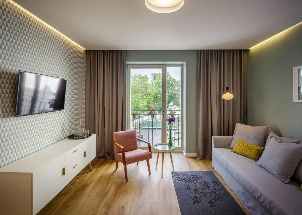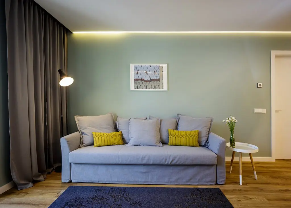 Pentru zona de zi, importanta fost conturarea unui living primitor. Intrucat va fi locuit perioade reduse de timp, nu vom gasi corpuri de biblioteca, ci doar o comoda suport pentru televizor. Dorind sa lase cat mai mult spatiu liber la nivelul pardoselii, designerul a optat pentru mobilier cu picioruse. Canapeaua si fotoliul alaturi de masuta de cafea si lampadar completeaza decorul acestei zone din apartament.