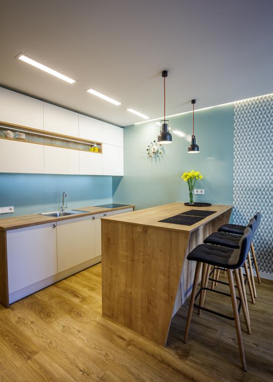Tot in aceasta incapere, vom gasi si bucataria. Fiind destinat inchirierii, s-a mizat pe o utilare cu strictul necesar a acestei zone. Chiar si in aceste conditii, mica bucatarie este conturata cu stil (vezi mobilierul, corpurile de iluminat, zona de bar). Daca si tu ai de amenajat un open space, inspira-te din felul cum a fost gandita delimitarea acestei functiuni: prin corpul tip bar folosit si pentru luat masa sau prin zugravirea peretelui.
