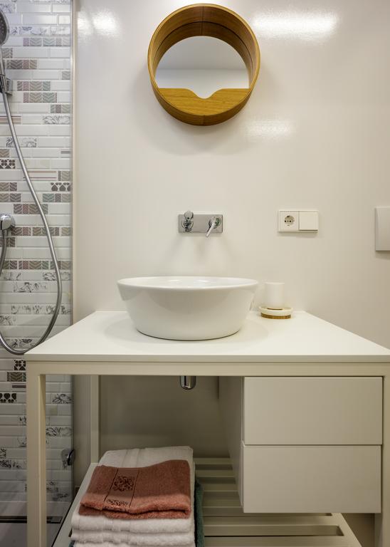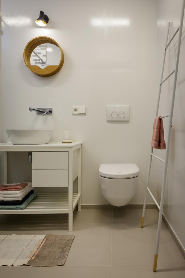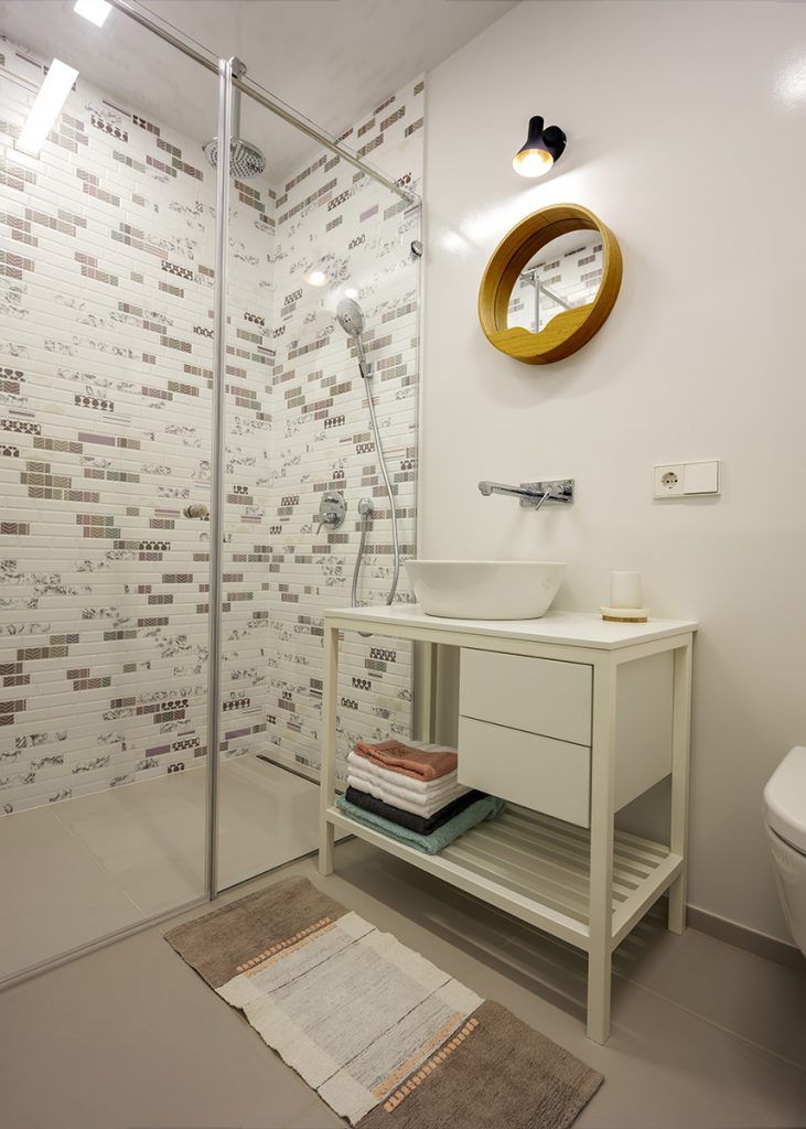Aceleasi criterii au fost adoptate si pentru baie, unde vom gasi un dus tip walk-in, lavoar cu depozitare si o scara ca suport pentru prosoape.