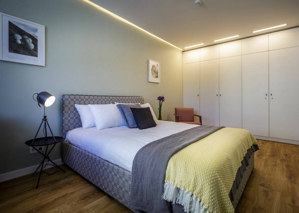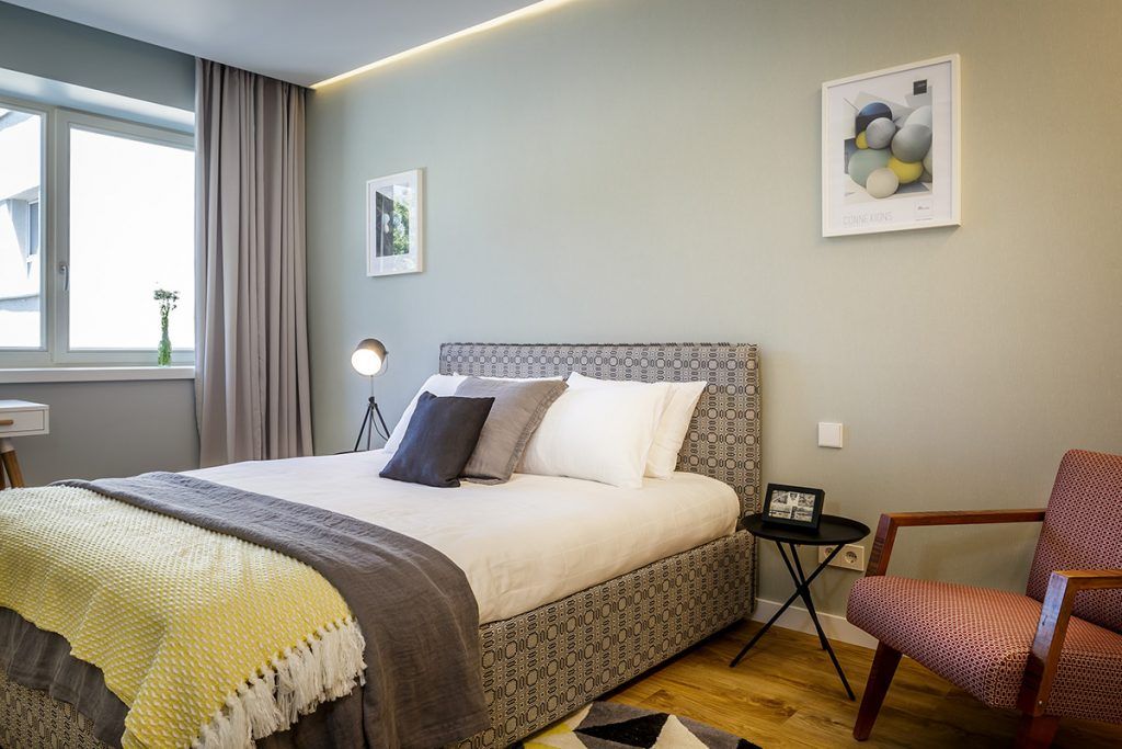 In dormitor, cel mai important aspect avut in vedere a fost acela al confortului. Patul matrimonial ocupa centrul camerei, cu un cadru si tablie tapitata. Dulapurile asigura o zona de depozitare generoasa pentru cei care doresc o sedere mai indelungata. Excelenta este si alegerea parchetului, acelasi in intreaga locuinta pentru a spori efectul de continuitate in amenajare. Micile detalii personalizeaza placut spatiul: veiozele, masutele, tablourile. Desi par nesemnificative, sunt importante pentru ca spatiul sa nu para monoton sau plictisitor.