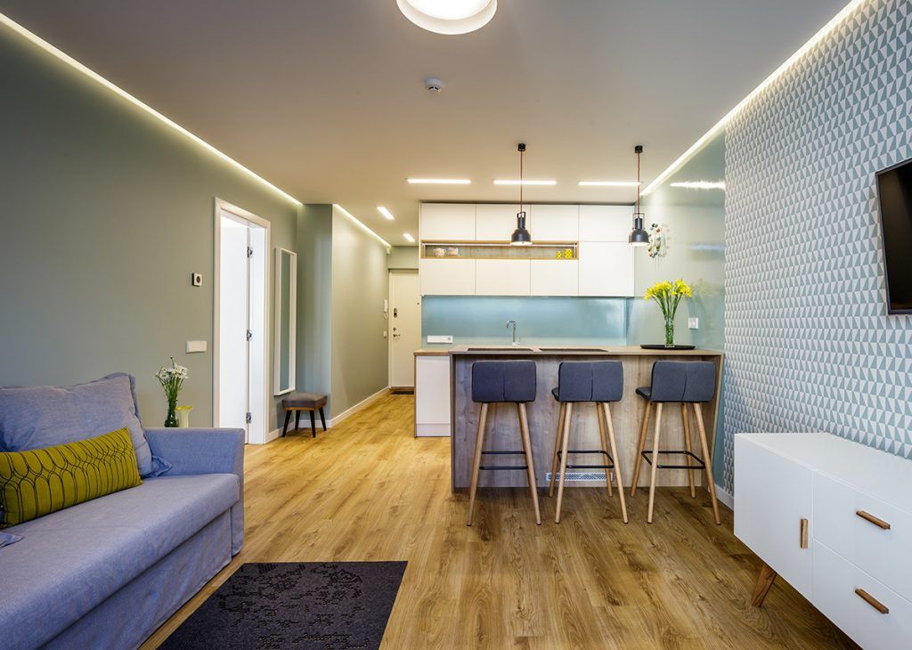 Pentru zona de zi, importanta fost conturarea unui living primitor. Intrucat va fi locuit perioade reduse de timp, nu vom gasi corpuri de biblioteca, ci doar o comoda suport pentru televizor. Dorind sa lase cat mai mult spatiu liber la nivelul pardoselii, designerul a optat pentru mobilier cu picioruse. Canapeaua si fotoliul alaturi de masuta de cafea si lampadar completeaza decorul acestei zone din apartament.