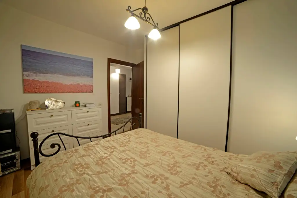 Dormitorul matrimonial se remarca prin prezenta unui pat din fier forjat ales de catre proprietari, iar culoarea peretului din spatele patului da un aer mediteranean incaperii.