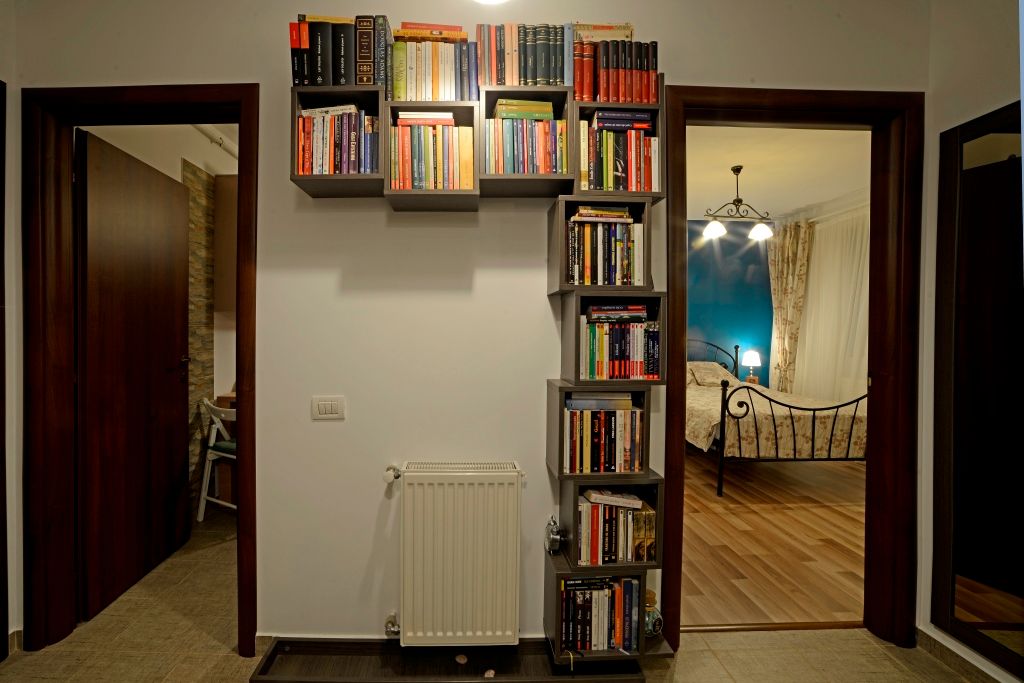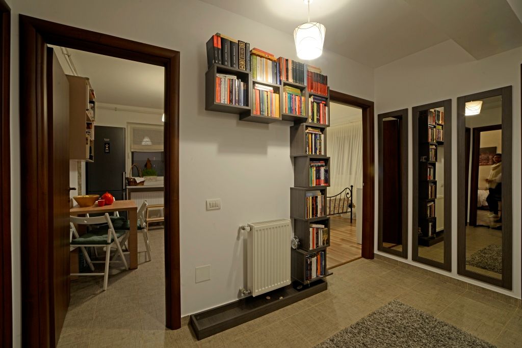 Pe hol a fost amplasata o biblioteca cu trasaturi minimaliste, iar culoarea acesteia se asorteaza perfect cu tocurile de la usi.