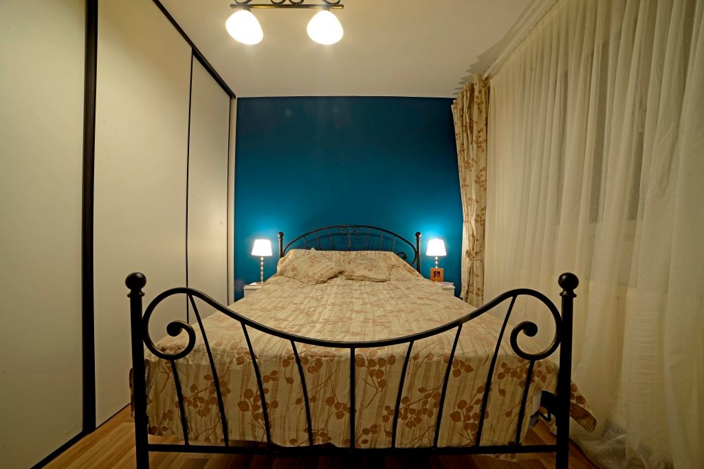 Dormitorul matrimonial se remarca prin prezenta unui pat din fier forjat ales de catre proprietari, iar culoarea peretului din spatele patului da un aer mediteranean incaperii.