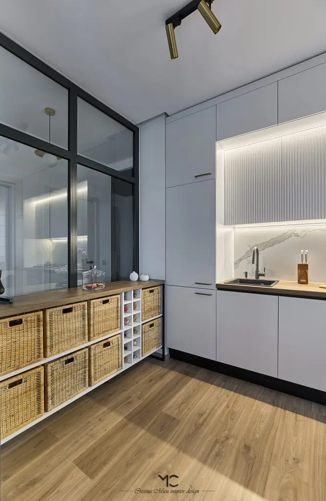 Zona de zi cuprinde holul de intrare, baia comuna, bucataria si livingul, care comunica vizual printr-o suprafata vitrata mare, cu usi glisante si rame metalice in stil industrial. Bucataria a fost gandita ca un spatiu functional, cu un flux de circulatie corect, cu multe spatii de depozitare, pana in taven, insa in acelasi timp este ocomponenta estetica importanta a amenajarii.