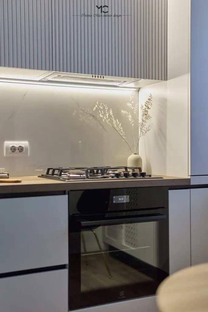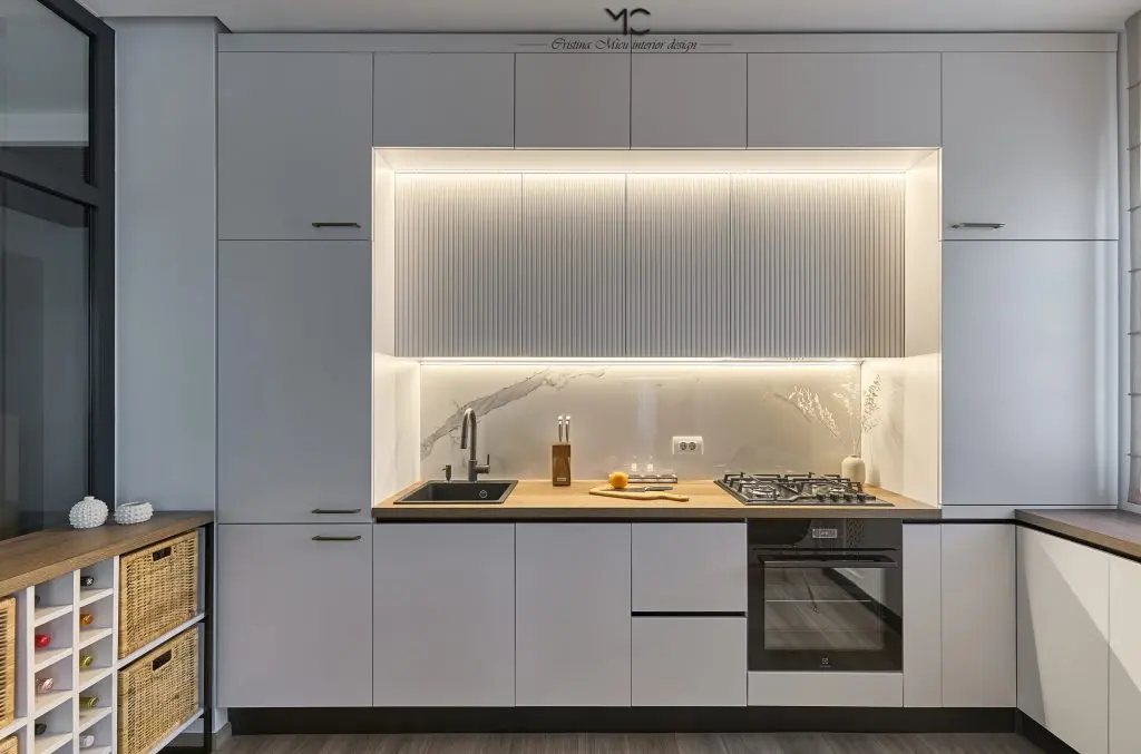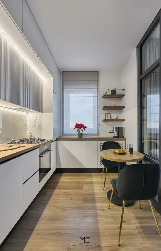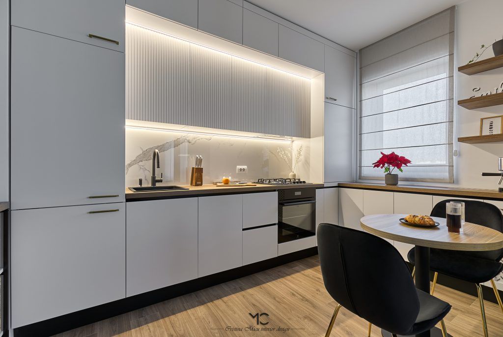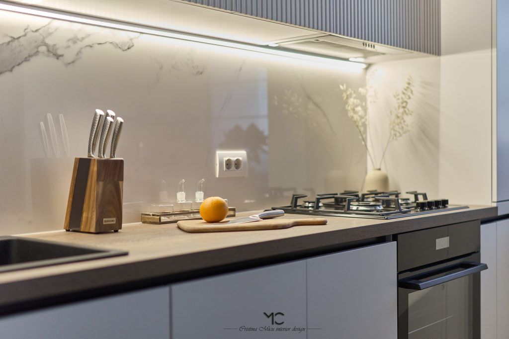 Despre mobilierul din bucatarie arhitectii ne povestesc ca “albul neutru al mobilierului se remarca totusi prin modelul riflat al corpurilor suspendate de mobilier, indirect luminate de banda L ED incastrata, iar placarea de perete cu compozit de quart, alaturi de blatul de lucru cu textura de lemn, vin sa completeze si sa creeze accente in bucatarie, in neutralitatea alba de fundal.”