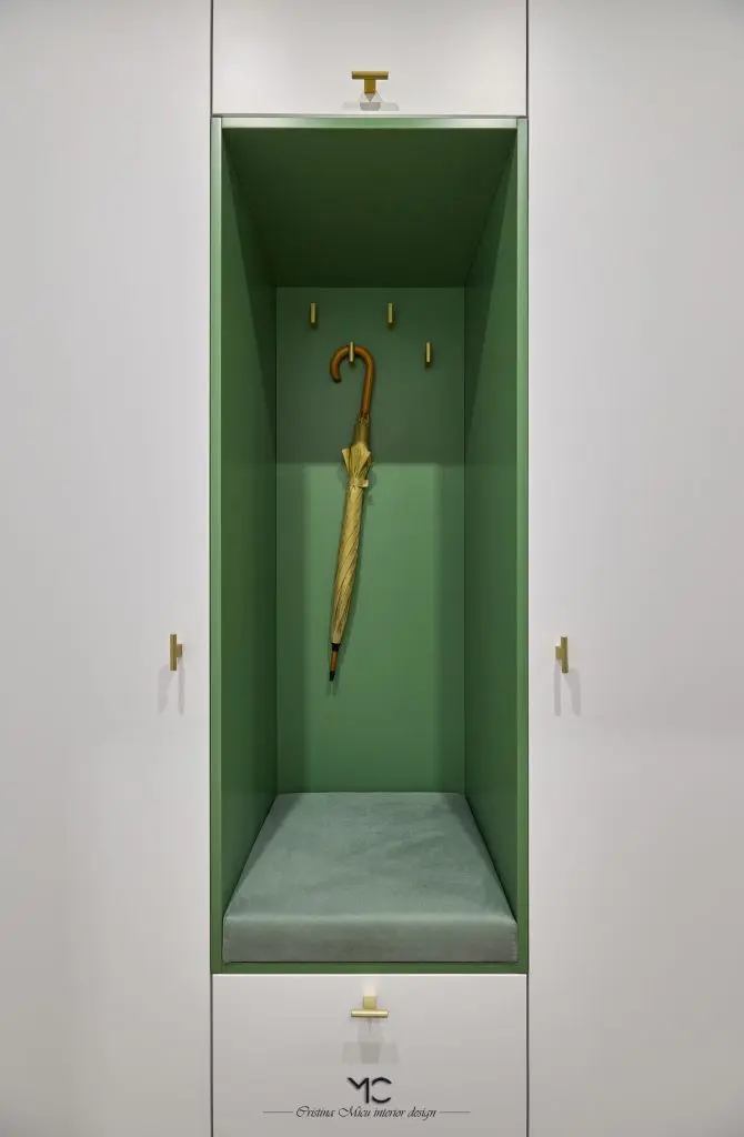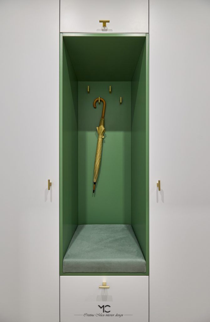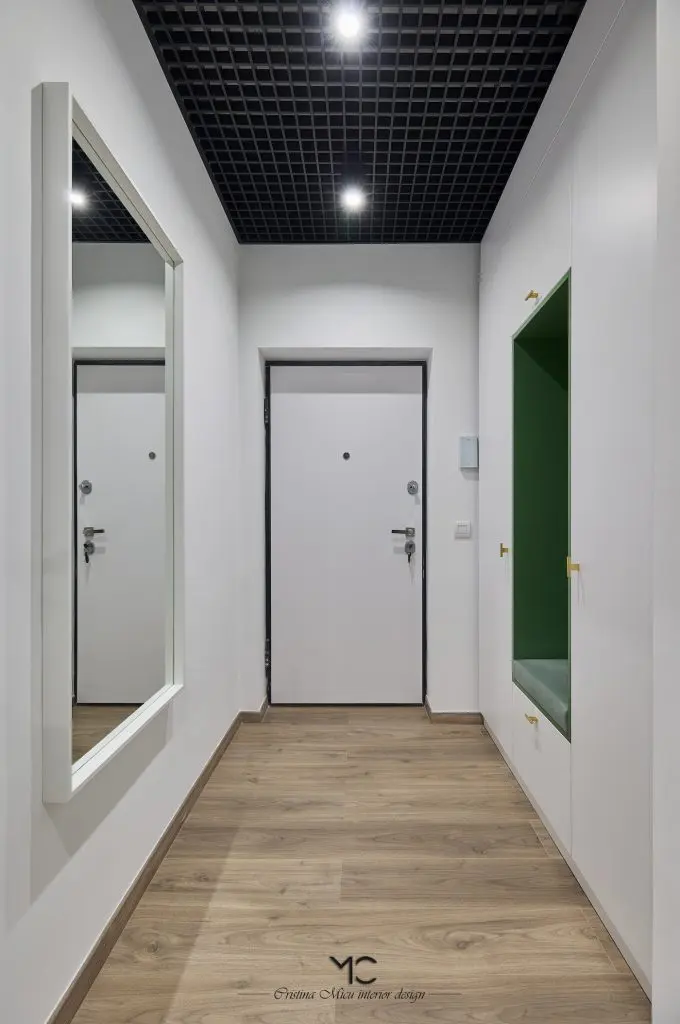Accente care amintesc de stilul industrial regasim si in hol unde a fost propus un tavan casetat negru cu spoturi mici. Contrastul cu piesele de mobilier albe cu accesorii aurii delicate si catifeaua verde a banchetei este unul extrem de placut.