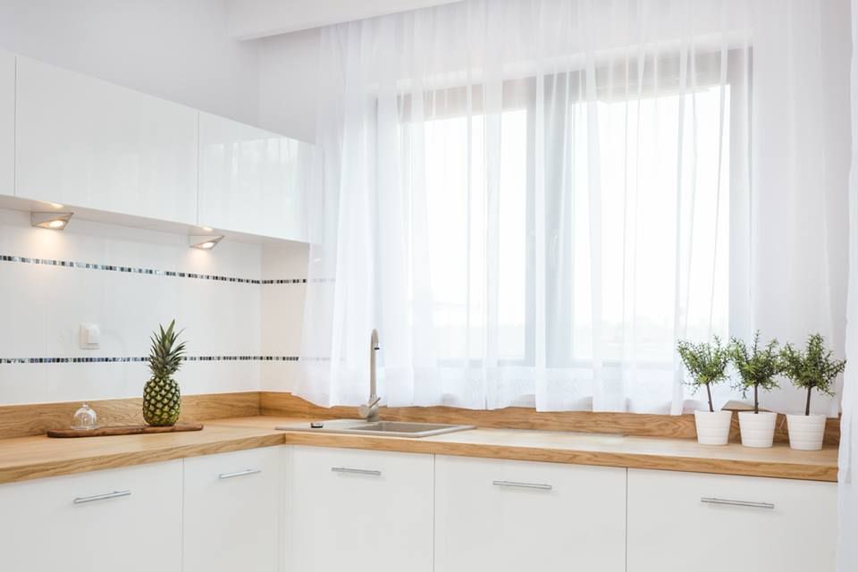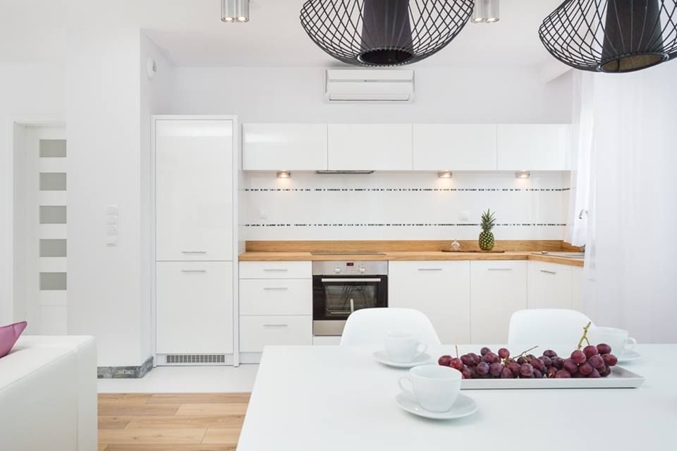 Pentru bucatarie s-a mizat pe aceeasi linie simpla, cu mobilier in forma literei L, cu depozitare concentrata in partea de jos, in dulapurile principale; cele suspendate se afla pe o singura latura a bucatariei. Blatul din lemn imprima caldura si un confort cromatic amenajarii. Electrocasnice sunt incorporate in mobilier pentru a pastra caracterul unitar al amenajarii.
