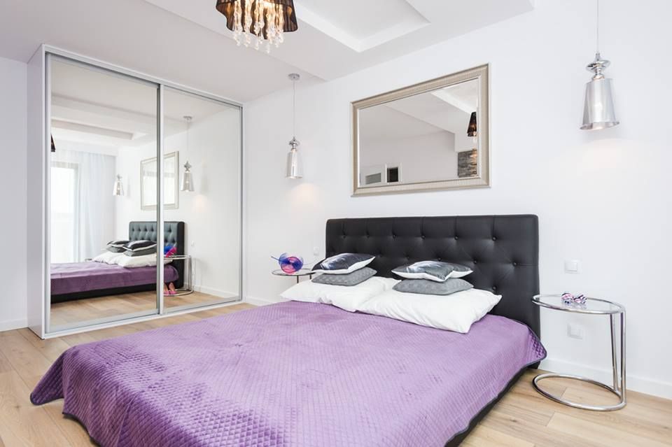In dormitor, amenajarea pastreaza simplitatea regasita la nivelul intregului apartament. Tablia tapitata, cuvertura mov, corpurile de iluminat, dar si jocul oglinzilor (cea montata deasupra patului si cele de pe usile dulapului cu haine) sunt detalii care confera un discret aer elegant camerei.