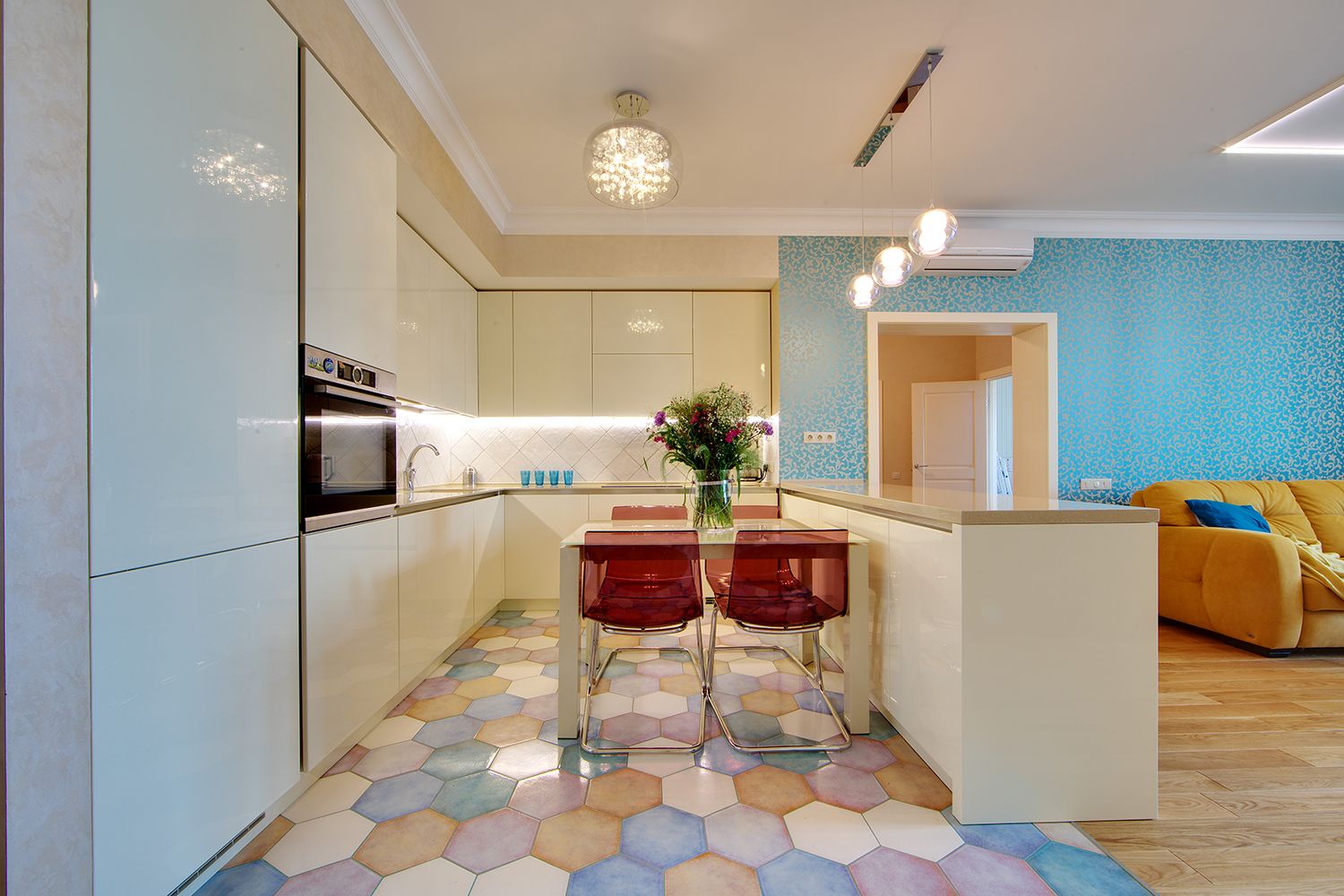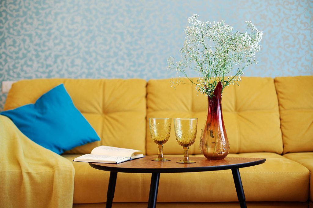 Cromatica vine sa ofere un plus de dinamica si personalitate camerei prin tapetul cu imprimeu albastru si canapeaua galbena, elemente ce reusesc sa creeze o zona de interes in amenajare. Profilul corpurilor de iluminat joaca si ele un rol important, punand in evidenta fiecare functiune in parte.