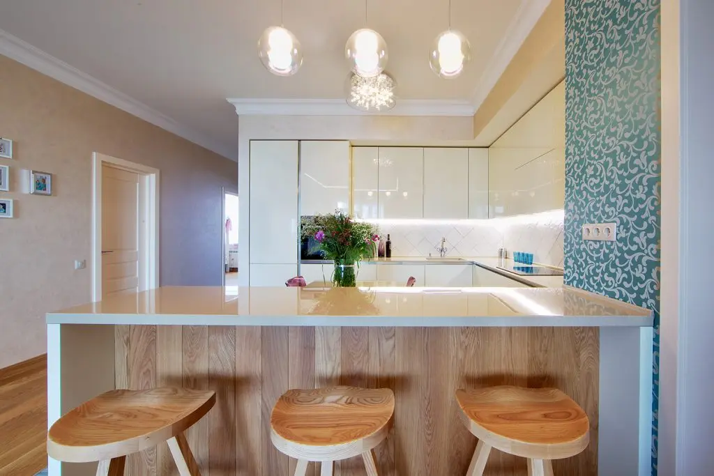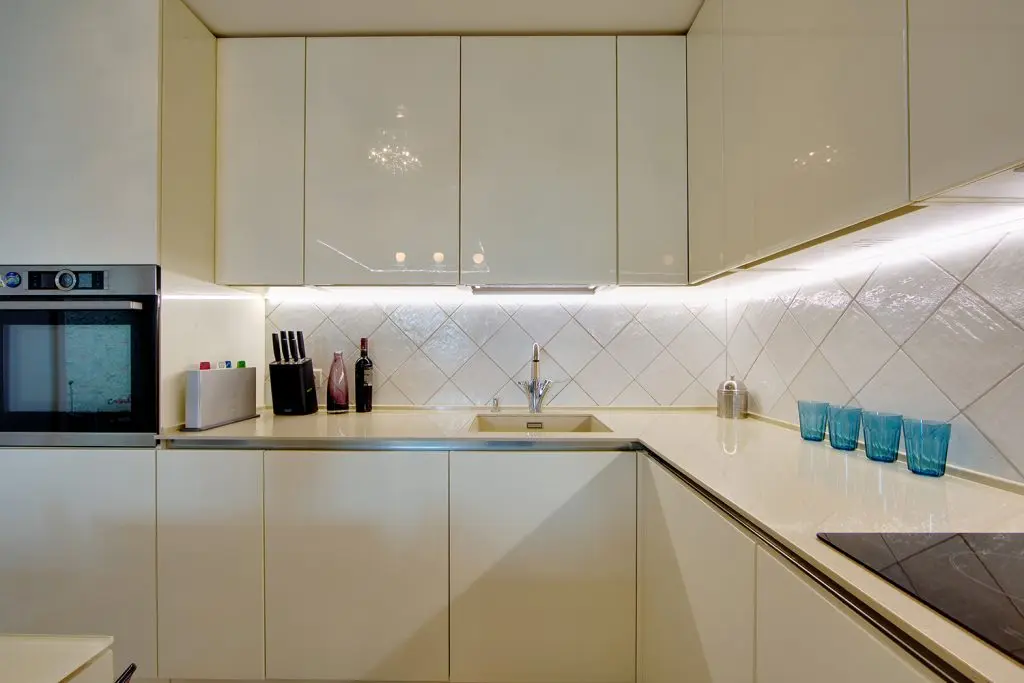 Spatiul bucatariei este unul compact, mobilierul cu finisaj lucios si electrocasnicele incorporate oferind unitate vizuala necesara in contextul deschiderii spre living. Placile decorative de la nivelul pardoselii surprind in mod placut si se incadreaza excelent pe fundalul predominant neutru al bucatariei.