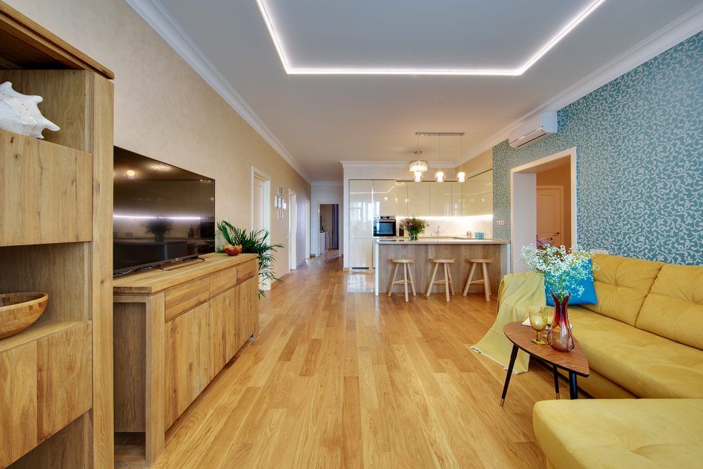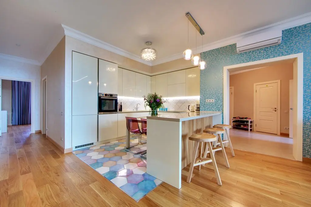 In zona de zi, livingul si bucataria formeaza un tot unitar, fiind reunite vizual prin intermediul parchetului. Zona de bucatarie sparge ritmul printr-o pardoseala din placi decorative colorate excelent integrate in spatiul acestei functiuni.