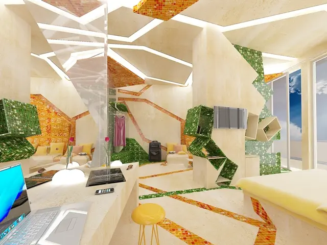 Pentru interioare s-a folosit cel mai mult verdele si galbenul, incorporate de culori calde, astfel incat se creeaza un spatiu destul de calduros si foarte primitor, in ciuda faptului ca s-a folosit multa gresie. Obiectele de mobilier din camera sunt si ele realizate din gresie din ceramica, un alt aspect neobisnuit, dar foarte interesant