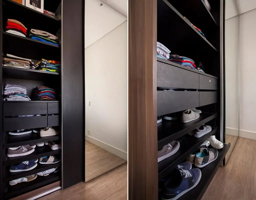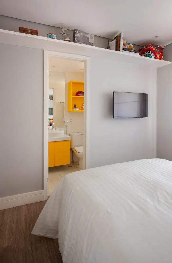 Pentru ca nu exista loc suficient pentru a aduce si o comoda in cadrul dormitorului, designerului a ales monteze o polita pe toata lungimea peretelui. O idee originala pentru a mai crea spatii de depozitare in special pentru diferite decoratiuni sau poate carti.
