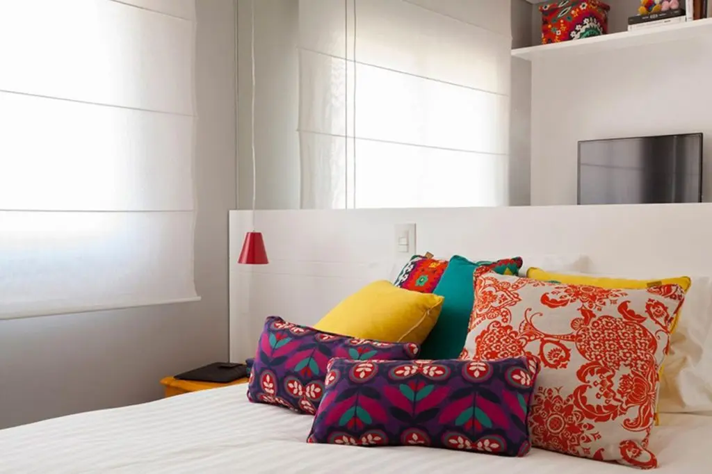 Albul predominant sprijina efectul oglinzii si in plus, reflecta lumina naturala. Pe acest fundal neutru, jocul culorilor dinamizeaza decorul si il face placut. Galbenul este o culoare solara ce imprima buna dispozitie si stare de bine. Corpul de iluminat rosu suspendat vine ca un mic accent de culoare pe care il regasim si in imprimeul pernelor decorative. Astfel, elementele ofera coerenta amenajarii.