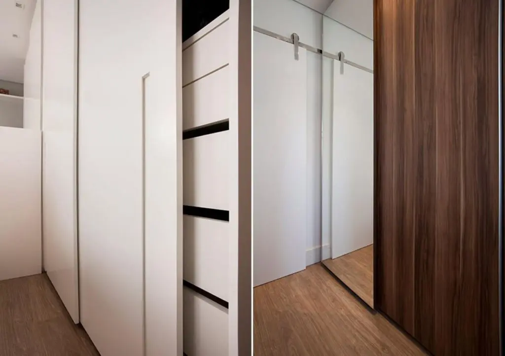 Pentru ca suprafata acestui dormitor este mica, designerul a mizat pe trucuri care sa amplifice spatiul. Oglinda de deasupra patului confera profunzime si iluzie ca intreaga camera pare mai mare decat in realitate. Pe peretele opus ferestrei, a fost amenajat un dressing in care sunt depozitate haine si incaltaminte deopotriva.