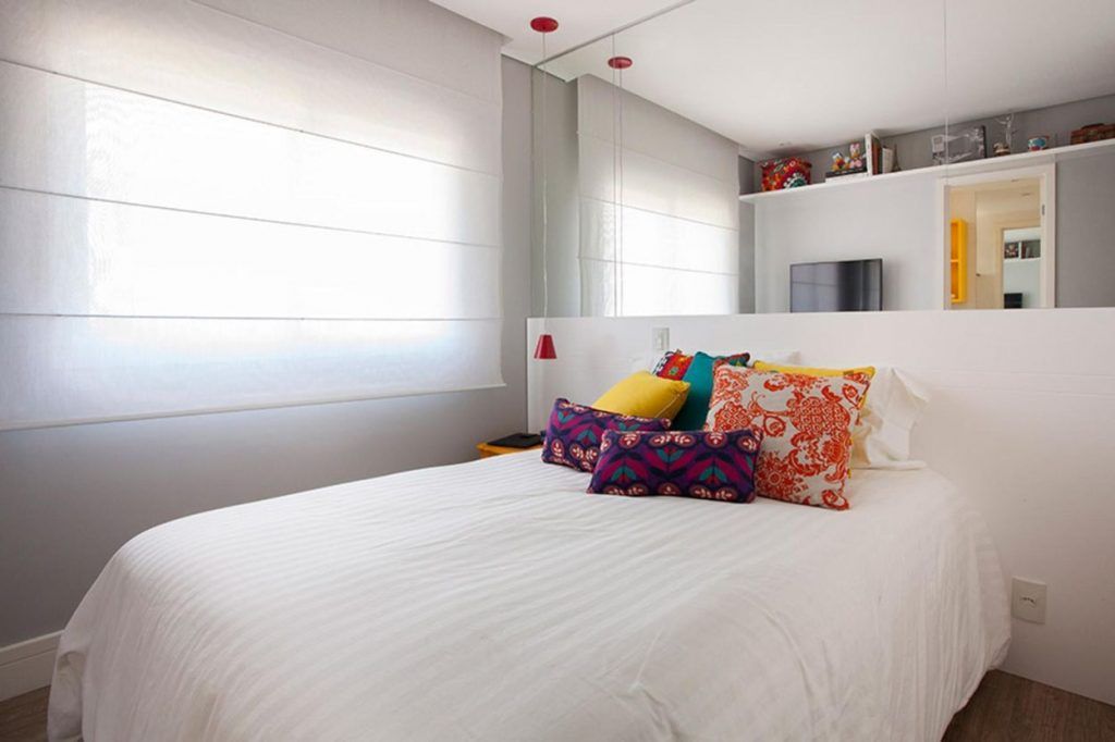 Pentru ca suprafata acestui dormitor este mica, designerul a mizat pe trucuri care sa amplifice spatiul. Oglinda de deasupra patului confera profunzime si iluzie ca intreaga camera pare mai mare decat in realitate. Pe peretele opus ferestrei, a fost amenajat un dressing in care sunt depozitate haine si incaltaminte deopotriva.