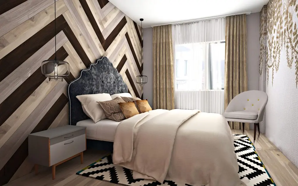 Dar poate cea mai interesanta incapere a casei, din punct de vedere al amenajarii, este dormitorul matrimonial. Peretele accent (cel din spatele patului) este realizat din lambriuri de lemn de diferite nuante. Asezate intr-o anumita ordine, intr-un joc de zigzaguri creeaza un impact in decorul camerei.