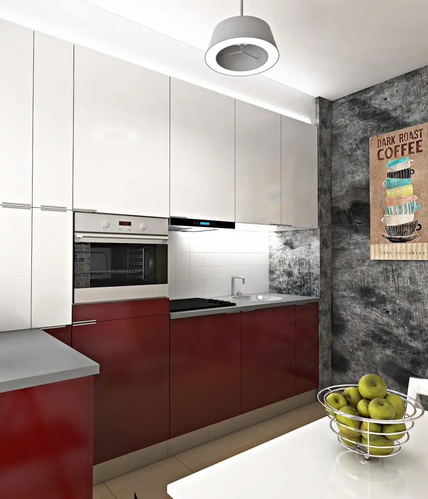 Nicispatiul bucatarieinu este unul de neglijat. In doar 8 metri patrati, arhitectii au reusit sa decoreze un spatiu functional cu foarte mult stil. Suprafetele netede si lucioase ale mobilierului se combina cu textura de beton aparent si un tapet cu mesaje care anima intregul spatiu.