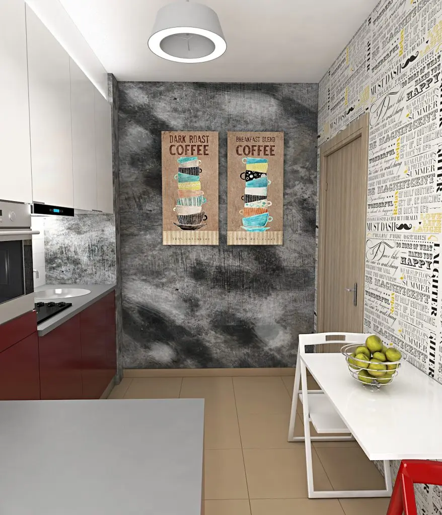 Cel din bucatarie si dormitor este de laWallpaperfromthe70s, cel din living fiind realizat pe comanda.