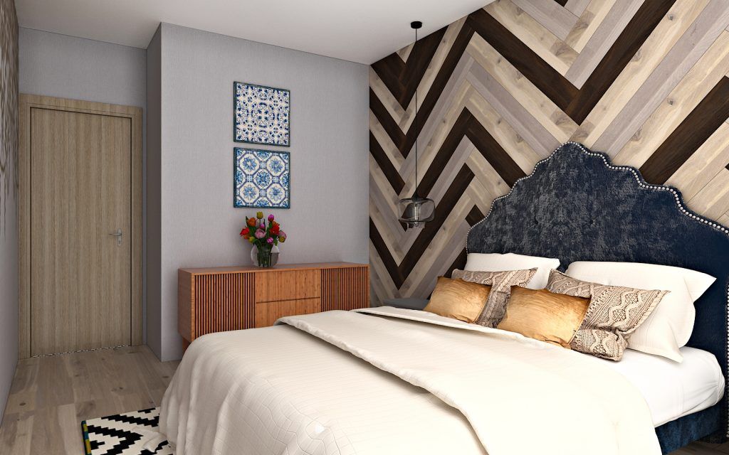 Dar poate cea mai interesanta incapere a casei, din punct de vedere al amenajarii, este dormitorul matrimonial. Peretele accent (cel din spatele patului) este realizat din lambriuri de lemn de diferite nuante. Asezate intr-o anumita ordine, intr-un joc de zigzaguri creeaza un impact in decorul camerei.