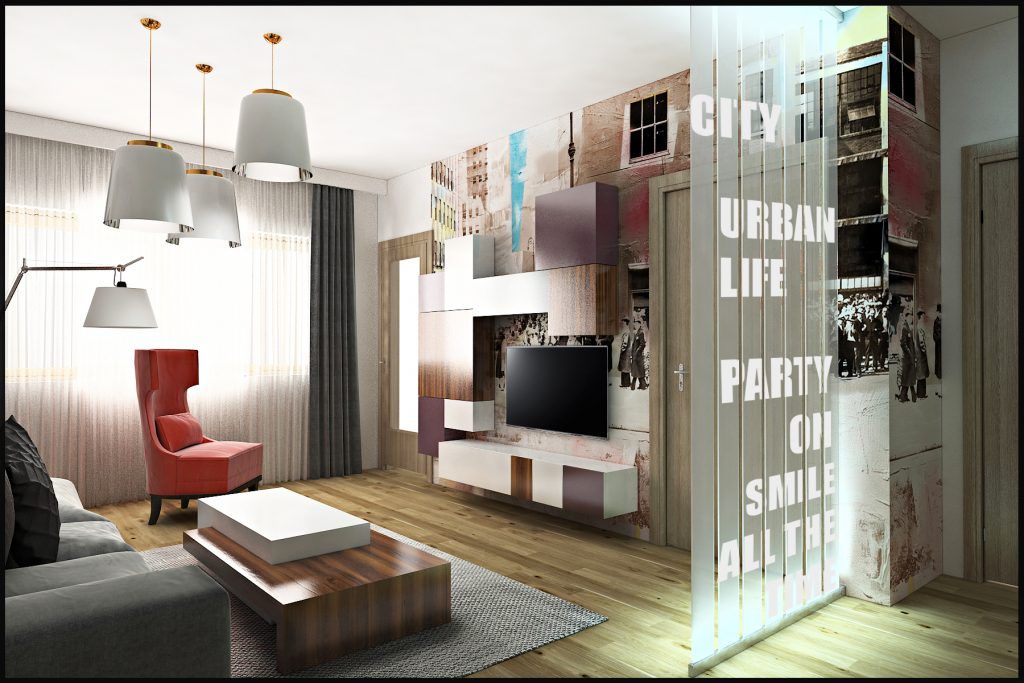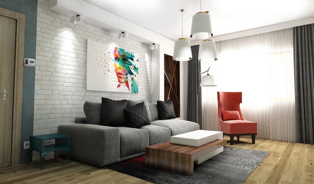 Tapetul decorativ sau caramida aparenta vopsita in alb sunt doar cateva din finisajele care imbogatesc vizual si textural spatiul livingului. Dinamic, vesel, cu insertii de culori-accent, asa s-ar putea defini ambientul acestei camere.