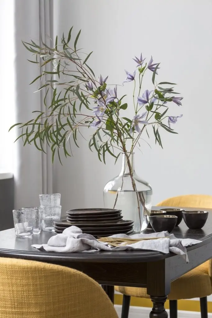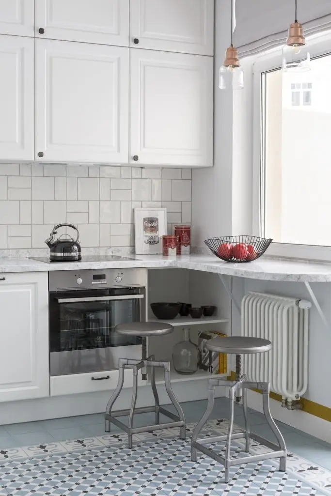 In zona bucatariei, spatiul a fost optim folosit prin depozitarea pe verticala. Designul mobilierului merge spre o linie clasica, cu usi frezate si manere negre. Abordarea este una eclectica prin expresie, placile decorative de la nivelul pardoselii si scaunele de inspiratie industriala fiind dovada acestui lucru.