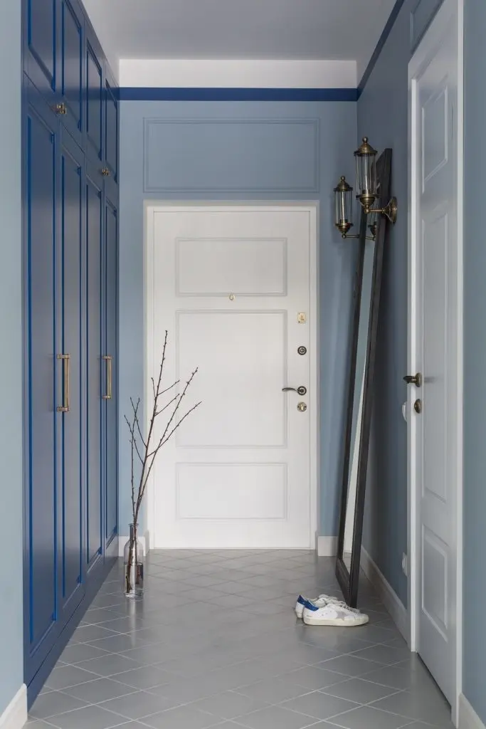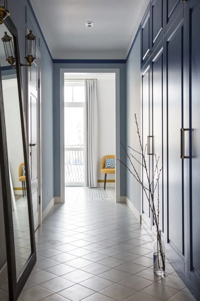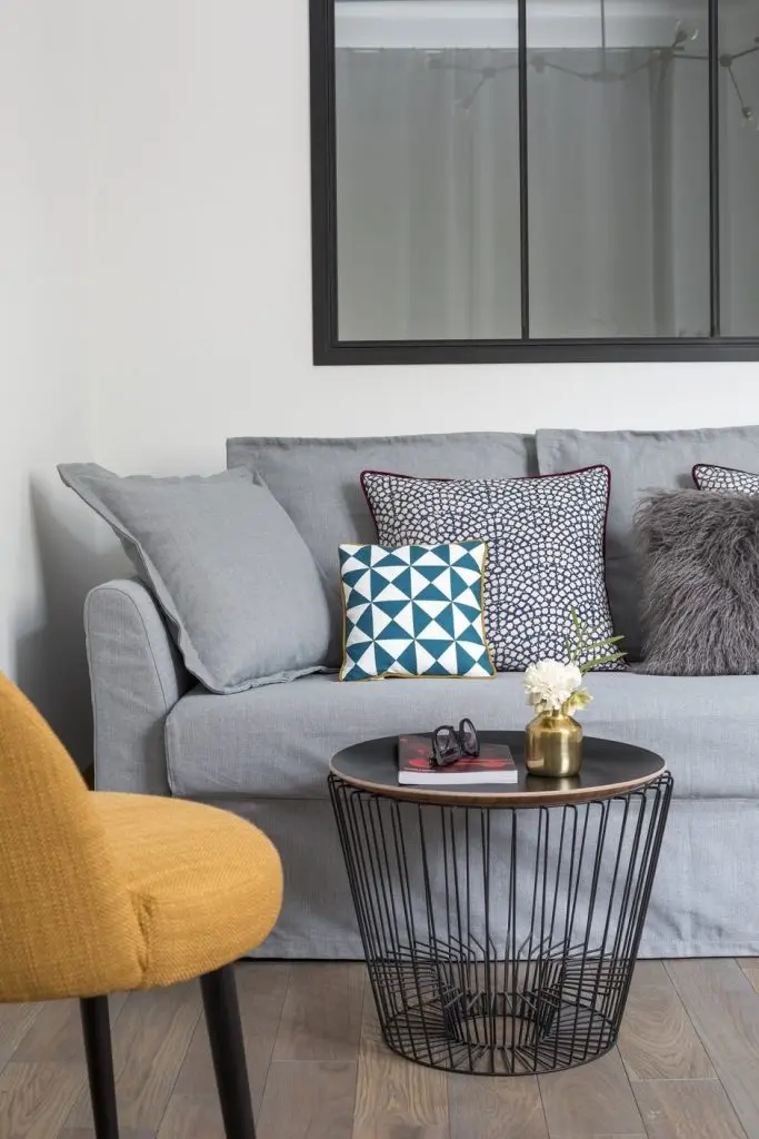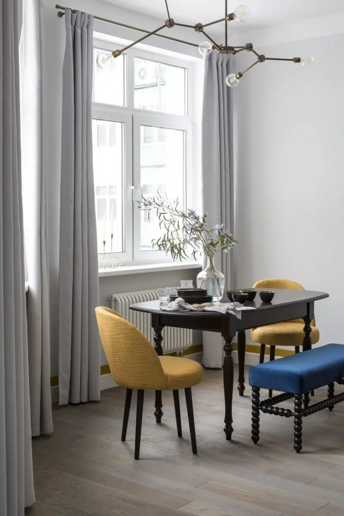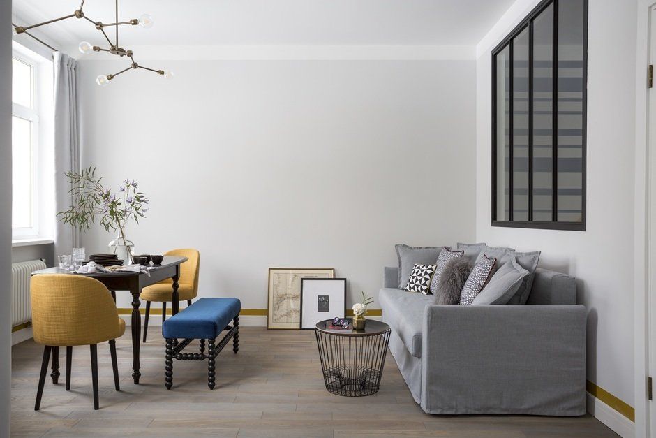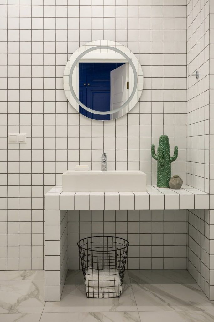 Stilistic, clienta a dorit un spatiu relaxant, fara piese de mobilier care sa incarce inutil spatiul; accentul s-a pus pe accesorii, tuse de culori care sa invioreze ambientul. Baza este una neutra, cu alb si gri pentru a pastra totul cat mai luminos, fluent, armonios. Galbenul-mustar si albastrul apar sub diferite forme atat in living, cat si in dormitor, baie sau hol.
