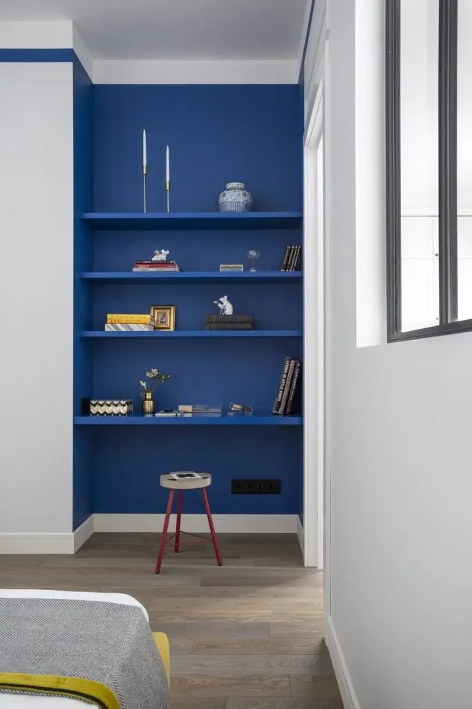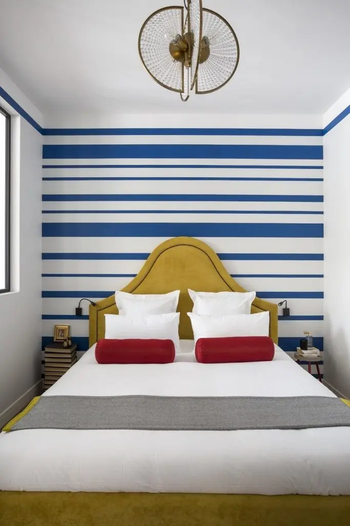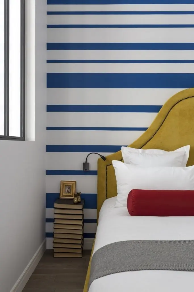 Pentru dormitor, amenajarea s-a concentrat pe crearea unui spatiu functional si cat mai luminos posibil. Fereastra falsa (o alternativa ar fi putut fi un glasvand) asigura lumina naturala, iar culorile alese amplifica spatiul; acelasi rol il au si dungile create pe peretele cu patul. Accentele de albastru coloreaza camera, inspirand relaxare.